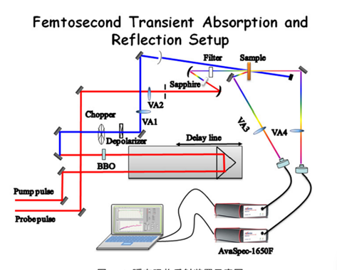 AvaSpec-ULS2048CL-EVO光譜儀在超快應用測試中可采用單通道或雙通道兩種方式。單通道方式是使用一臺光譜儀預先測試存儲未放置樣品時寬帶白光的光作為參考,隨后使用該光譜儀測試白光經過樣品后的吸收光譜。雙通道方式是采用兩臺光譜儀,一臺光譜儀測試白光經過樣品的光譜,另外一臺光譜儀實時測試寬帶白光的光源作為參考,避免光源不穩定對結果的影響,兩臺光譜儀可通過歸一化消除臺間差,通過同步線保證響應同步。此外,因為光譜儀的靈活性,研究者可根據自己的實驗需求設計光譜儀的測試方式,以下兩圖為原吉林大學隋來志博士設計的測試光路。