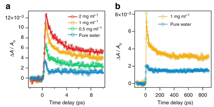圖 6: TAS spectra of CNCbl in water, ethanol, and a 1:1 mixture of water and ethanol. Excited with a 266 nm pump laser [3]. 氧化石墨烯的光還原 由馬克斯·普朗克研究所(the Max Planck Institute),漢堡大學(University of Hamburg),約阿尼納大學(University of Ioannina)和多倫多大學(University of Toronto)組成的聯合小組使用瞬態吸收光譜技術更好地解釋了氧化石墨烯的光還原過程[4]。在這項研究中,他們通過瞬態吸收光譜觀察了兩個重疊的衰減,一個發生在2 ps以下,另外一個發生在2 ps至250 ps之間,最終表明光還原過程是一個多步驟過程。快速衰減與氧化石墨烯離子化和產生水的溶劑化電子相關,然后溶劑化電子與氧化石墨烯相互作用導致在緩慢衰變期間引起還原。 圖7中所示的數據是使用Avantes光纖耦合光譜儀收集的,并使用266 nm泵浦激光激發。