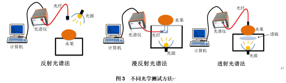 目前用于水果無損檢測的主要光譜檢測方法有反射光譜法、漫反射光譜法、透射光譜法,其光路分別如下圖所示。在這些光路中,光源可采用單個(gè)或多個(gè)50 W鹵素?zé)艚M合的方式,既可以提高光照功率,也可以提高光照均勻度。光譜儀可以采用Avantes生產(chǎn)的光纖光譜儀,其體積小,方便集成到系統(tǒng)中,波長范圍最多可以覆蓋200-2500 nm,最短積分時(shí)間可以達(dá)到2 μs,滿足對全部物料快速、高效的測試需求。光纖可采用Avantes 800 μm或者1000 μm的大芯徑,提高光通量,金屬鎧甲包層可保護(hù)光纖避免損傷。此外,Avantes也可提供多種附件選擇,滿足不同的應(yīng)用場景。
