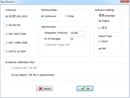 3.開啟日曬儀,同時(shí)連接好光纖探頭與AvaSun高靈敏度光譜輻照儀,打開光譜測量軟件,根據(jù)待測日曬儀的類型進(jìn)行軟件設(shè)置