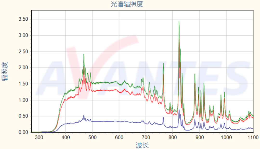 基于AvaSolar分光輻射儀特有的快速采集功能,也可應用在瞬態模擬器的光譜檢測中。AvaSolar可實現每秒鐘450幅光譜的采集,不管模擬器的工作模式是單次脈沖、多次頻閃,無論脈沖弛豫時間是小到2ms,還是較長的6s,AvaSolar設備均可得到真實可靠的輻照度數據。 以20 ms脈沖弛豫時間的氙燈為例,圖2顯示了在一個脈沖周期內,不同時間點的絕對輻射能量光譜。在脈沖氙燈工作的同時,由太陽能模擬器系統給光譜儀一個TTL信號,觸發光譜儀開始工作。通過綠、紅、藍這三個順序測量得到的光譜圖比較可知,脈沖氙燈的能量輸出在逐漸的減弱。