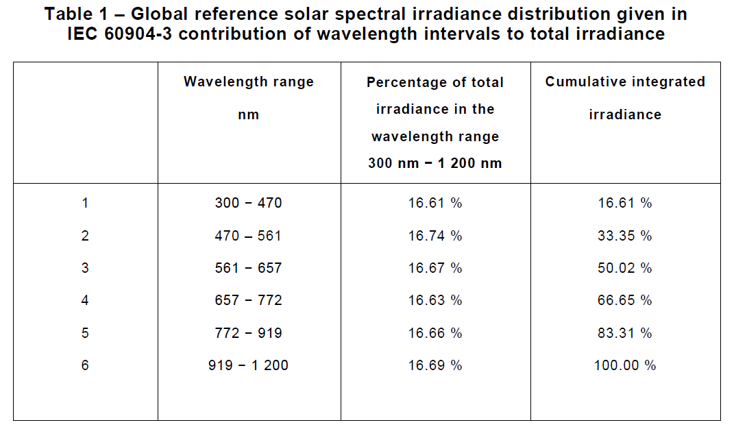太陽模擬器的光譜匹配度是指在6個指定光譜范圍內強度積分的百分比(見列表)。任何與標準光譜的偏離百分比都必須在一定的范圍內,這也正是衡量太陽模擬器等級的一項標準。對于A類太陽模擬器,光譜匹配度必須在75%~125%之間。