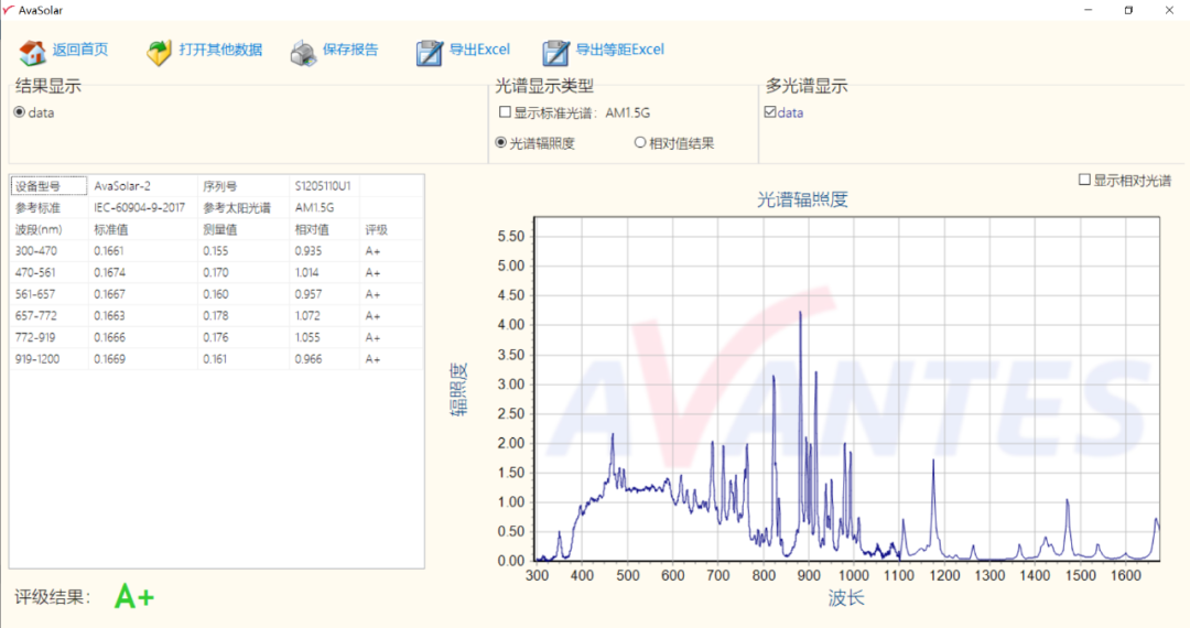 AvaSolar軟件可按照IEC60904標準上所述要求,根據測試得到的模擬器輻照度光譜數據直接給出模擬器的等級,可給出不同波段范圍內的匹配度,以幫助用戶更好的判斷模擬器的性能。