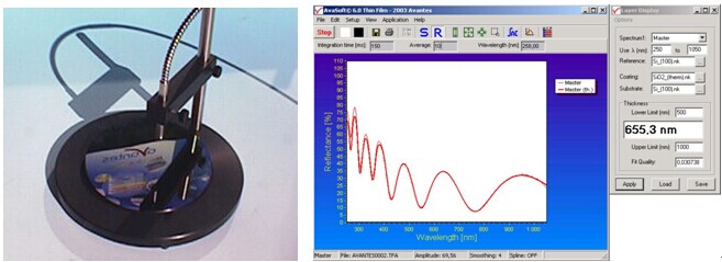 薄膜測量系統(tǒng)是基于白光干涉的原理來確定光學薄膜的厚度。白光干涉圖樣通過數(shù)學函數(shù)被計算出薄膜厚度。對于單層膜來說,如果已知薄膜介質(zhì)的n和k值就可以計算出它的物理厚度。 AvaSoft-Thinfilm應用軟件內(nèi)包含有一個大部分常用材料和膜層n和k值的內(nèi)置數(shù)據(jù)庫。 AvaSoft-Thinfilm系統(tǒng)可以測量的膜層厚度從10 nm到50 um,分辨率可達1 nm。 薄膜測量應用于半導體晶片生產(chǎn)工業(yè),此時需要監(jiān)控等離子刻蝕和沉積加工過程。還可以用于其它需要測量在金屬和玻璃基底上鍍制透明膜層的領(lǐng)域。其他領(lǐng)域中,金屬表面的透明涂層和玻璃襯底也需要嚴格測量。 AvaSoft-Thinfilm應用軟件能夠?qū)崟r監(jiān)控膜層厚度,并且可以與其他AvaSoft應用軟件如XLS輸出到Excel軟件和過程監(jiān)控軟件一起使用。 薄膜測量的典型裝置如圖所示。